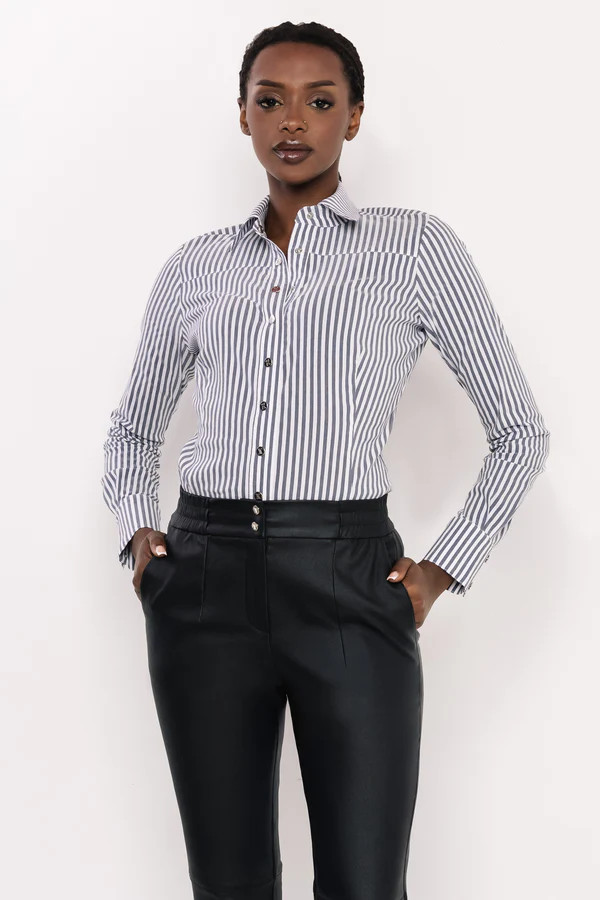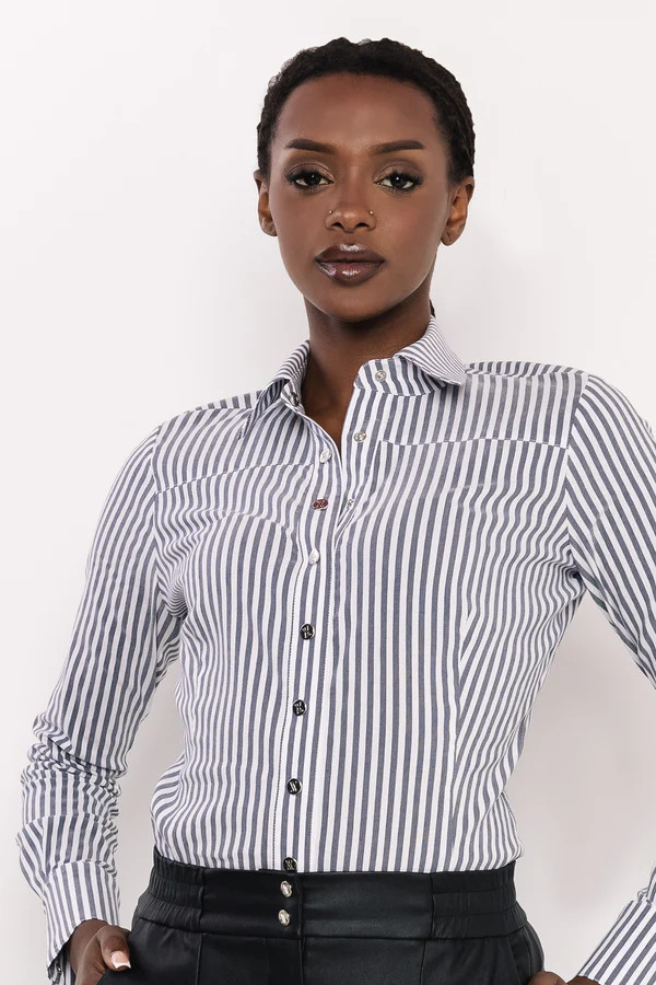 A csíkos minta optikailag nyújtja az alakot, és friss dinamizmust ad a darabnak. A gondosan kidolgozott részletek – például a karcsúsító szabásvonalak – biztosítják, hogy a body egyszerre legyen praktikus és stílusos. A klasszikus inghatás miatt sokoldalúan kombinálható, és a szezon bármely alkalmi vagy hétköznapi szettjének alapját adhatja.