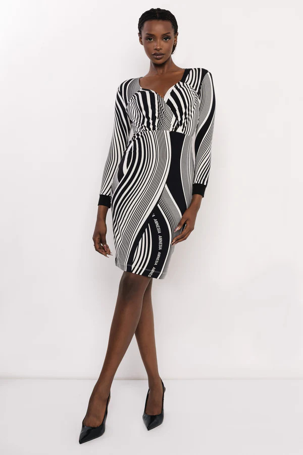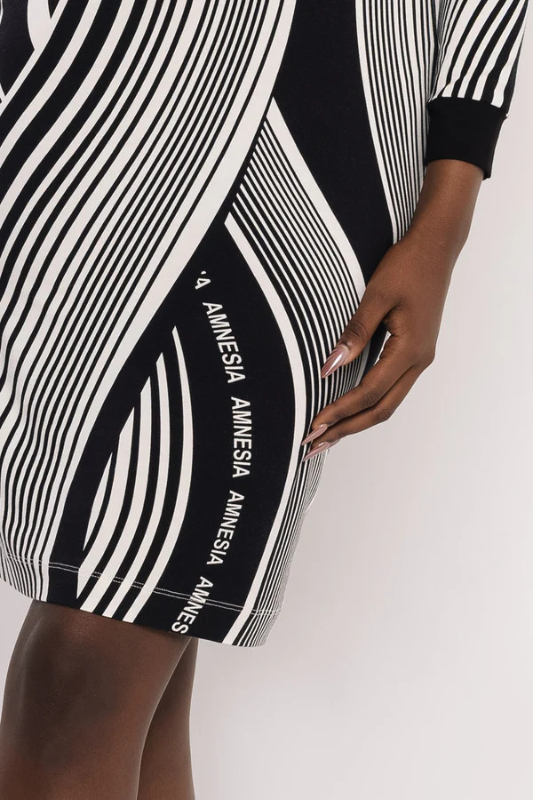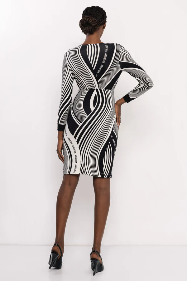 Az AMNESIA Monsa ruha az a darab, amelyben a nőies elegancia és a modern stílus találkozik. A figyelemfelkeltő fekete-fehér minta játékosan követi a test vonalait, kiemelve és hangsúlyozva a sziluettet.