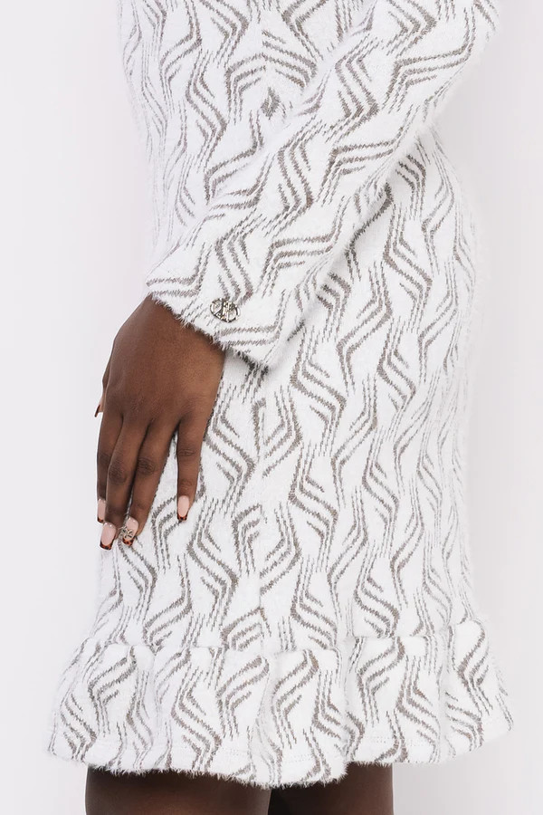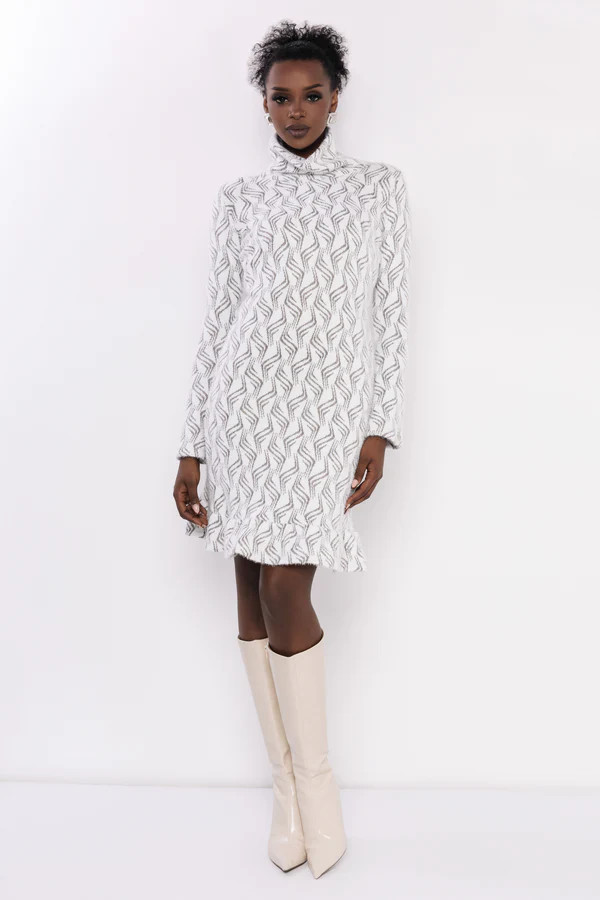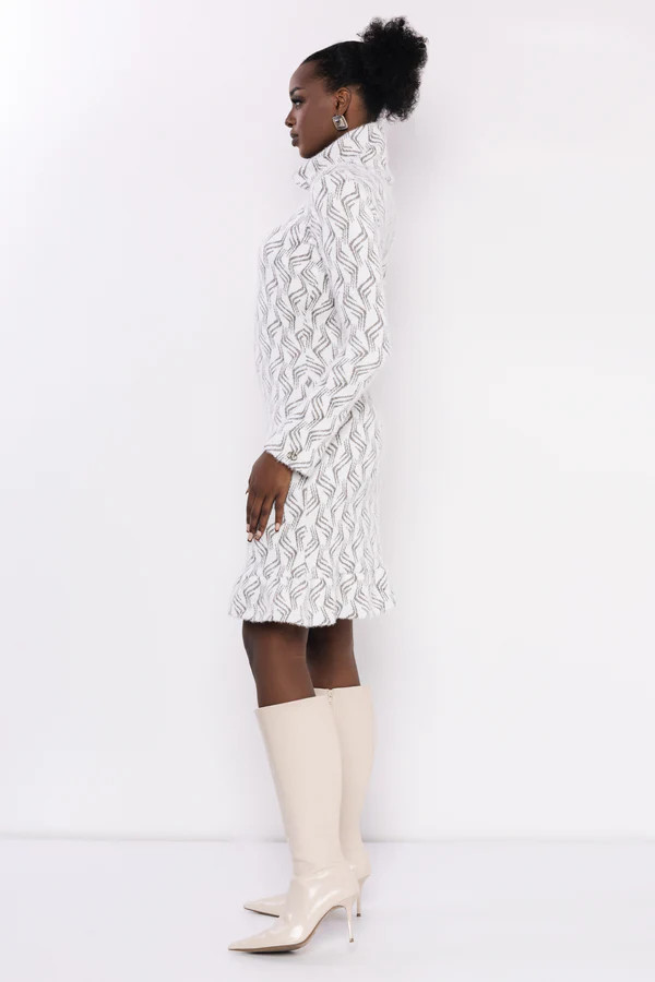 Az AMNESIA Ruano ruha egy különleges, puha tapintású szőrös jacquard anyagból készült darab, amely a kényelem és az elegancia tökéletes kombinációját nyújtja. A garbónyak és a nőiesen lezser szabás optikailag nyújtja az alakot, míg az alján a fodrok játékos, nőies karaktert ad a ruhának.