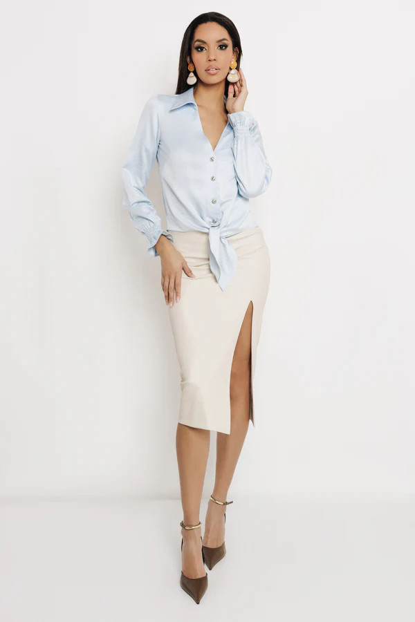 Az AMNESIA Raffi blúz a tavaszi AMNESIA kollekció egyik legcsinosabb, „felkapom és kész” darabja. A gallér, a fém gombok és az elöl megköthető rész olyan összhatást ad, amitől az egész szetted elegánsnak és nőiesnek hat. Krémben és világoskékben is igazi alapdarab, amit sokféle hangulathoz tudsz igazítani.