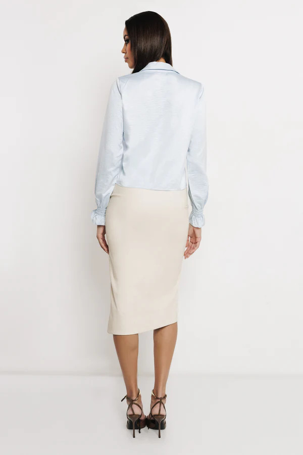 Gyűrt selyem anyagból készül, ami könnyű, lágy esésű és elegáns megjelenést ad. A blúz elején gombsor fut végig, a derekánál megkötős rész szépen formálja az összképet, az ujja pedig gumírozott mandzsettával és finom fodros lezárással készült. S/M és L/XL méretben érhető el, krém és világoskék színben.